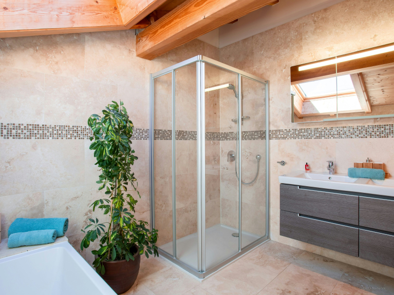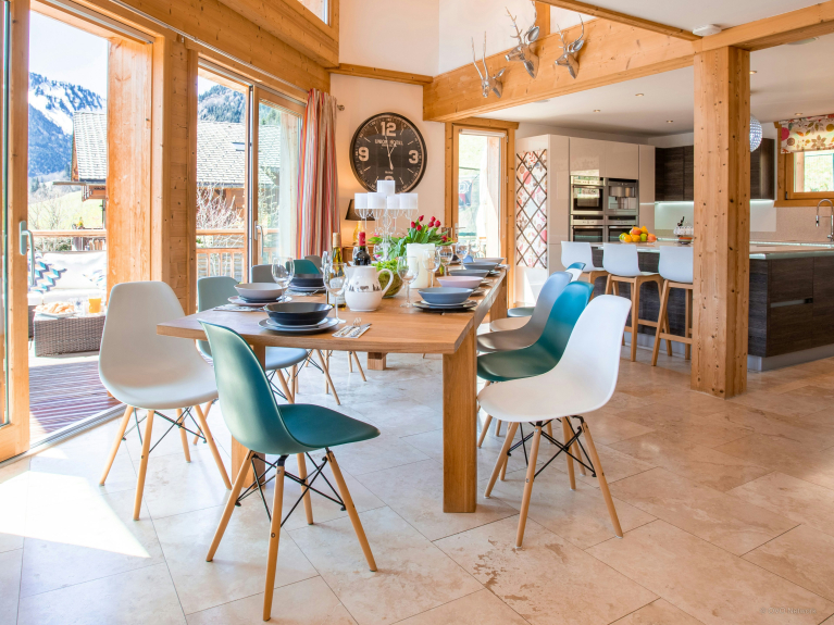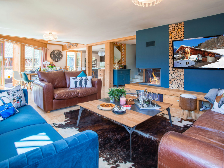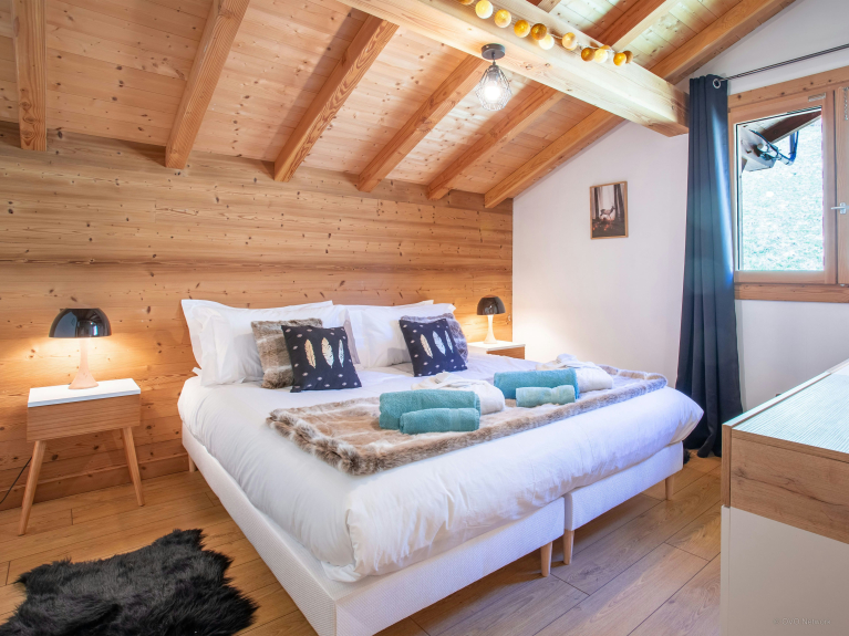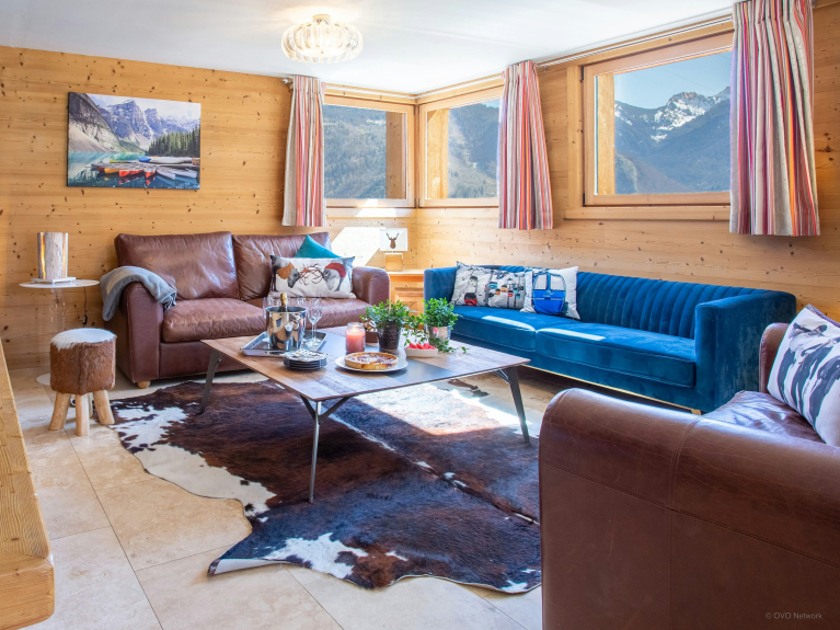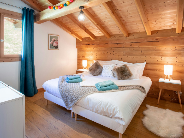Cette configuration conviendra à plusieurs familles ou à différentes générations qui choisissent de passer ensemble leurs vacances. La présence de chambres et de salles d’eau aux trois niveaux présente l’avantage d’offrir à chacun son espace. Nous aimons la décoration originale et très inhabituelle pour un chalet de montagne.