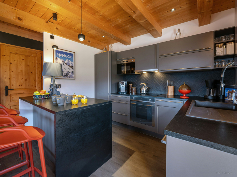 Le décor du Chalet Sivara est chaleureux, et ses éclairages uniques, ses meubles sur mesure et ses pièces de collection lui confèrent une touche d’originalité, comme le prouve par exemple l’audacieux meuble de télévision. Préparer de bons plats est un vrai plaisir dans la cuisine équipée, et les fauteuils très confortables de la table à manger promettent de longs moments de convivialité. Le salon adjacent, équipé d’un poêle à bois, est particulièrement agréable.