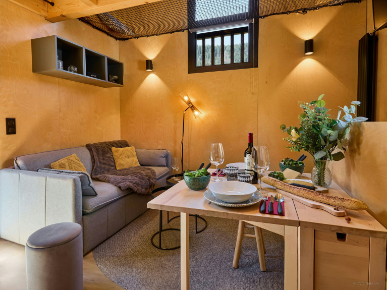 Le chalet Sideflip est compact et fonctionnel, offrant à une famille de quatre personnes tous les équipements disponibles dans un grand chalet. Attention, l’accès à la mezzanine par une échelle n’est pas recommandé aux jeunes enfants, mais les adolescents adoreront cet espace, qui est équipé d’un filet permettant d’observer la pièce du dessous.