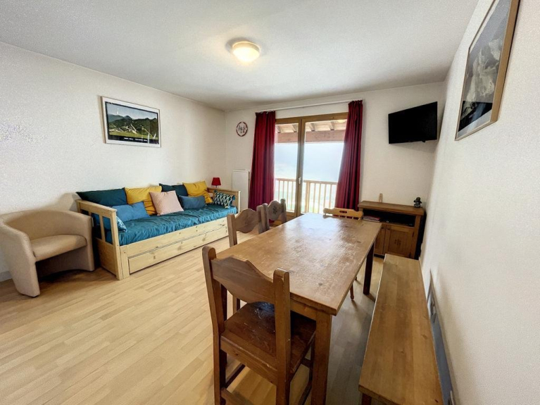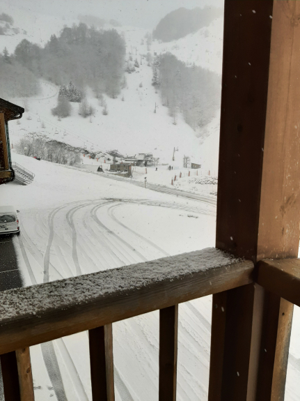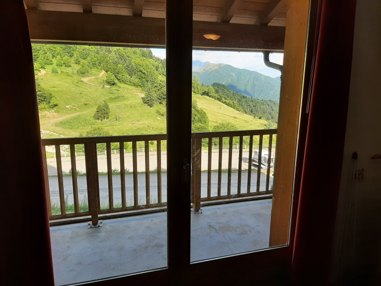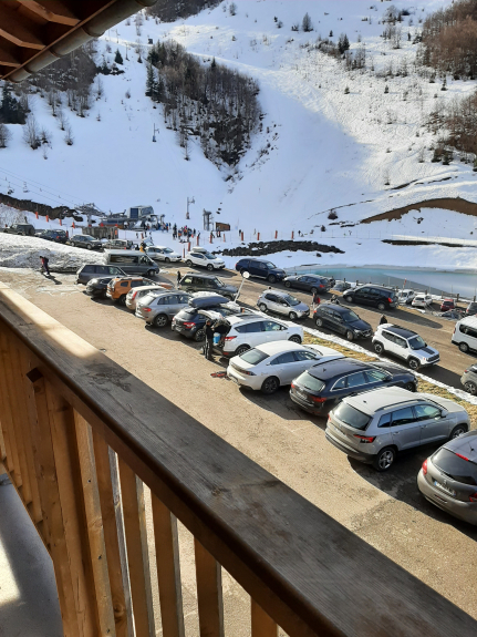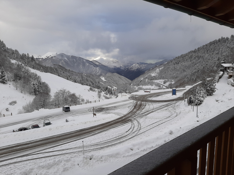 Un grand balcon de 14m² (8 mètres de long) avec une vue imprenable sur les montagnes, la vallée, l’entrée de la station et une remontée mécanique.