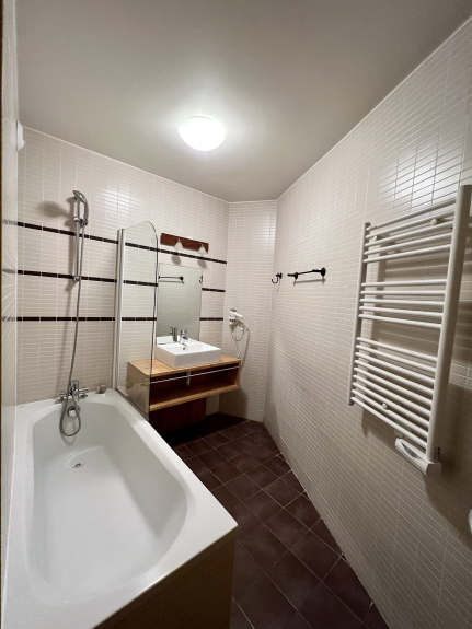 - 1 grande salle de bain avec baignoire à l’entrée.