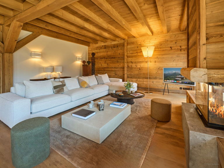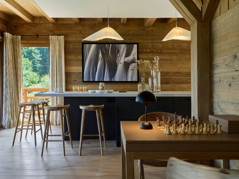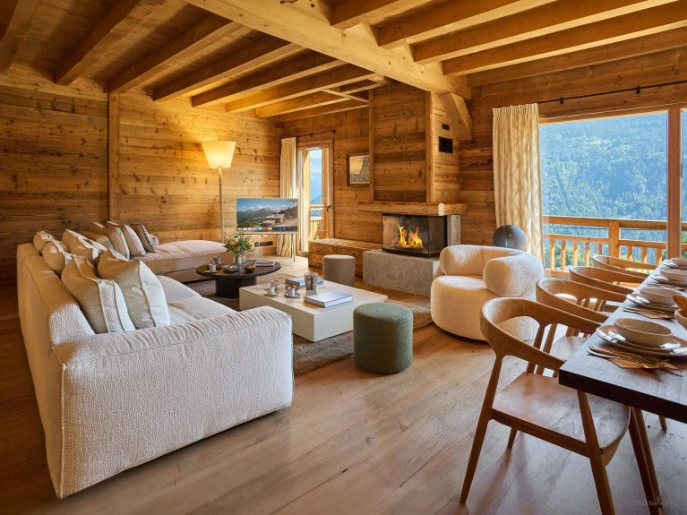 La pièce de vie, spacieuse et lumineuse, est aménagée au rez-de-chaussée. Elle comporte un large canapé modulaire placé face à une cheminée, une table d’échecs, et une table à manger qui peut accueillir tout votre groupe. Vous aurez plaisir à préparer vos repas dans la cuisine ouverte, qui compte un four, une plaque à induction, un lave-vaisselle, un réfrigérateur-congélateur, un four à micro-ondes, ainsi qu’un comptoir central avec tabourets. Des portes-fenêtres mènent à une terrasse couverte, où vous pourrez profiter du barbecue et du majestueux panorama alpin.