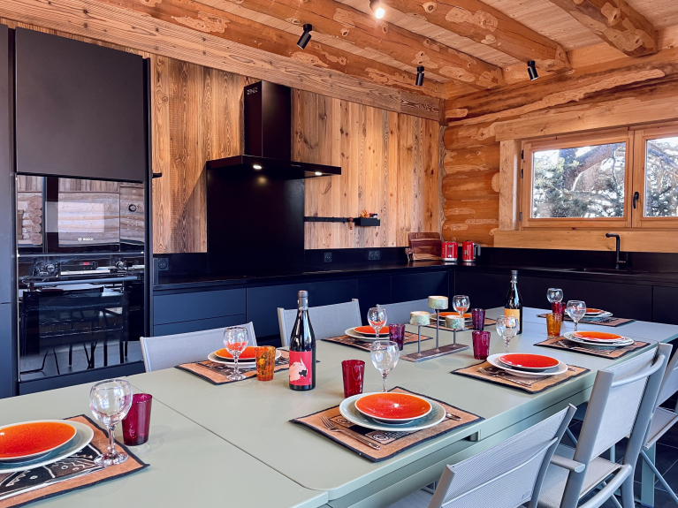 un grand canapé en L entoure la cheminée (foyer cheminée à bois),cuisine équipée de four et four à micro-ondes Bosch,table à rallonges pour 14 personnes,lave-vaisselle Miele, plaque à induction ,cafetière Nespresso et cafetière à filtres /mixeur...