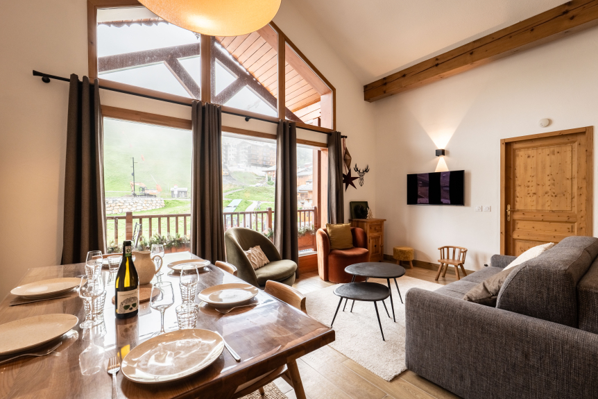Un séjour avec canapé et TV, accès au balcon: Luminosité garantie, et vue exceptionnelle sur la station.