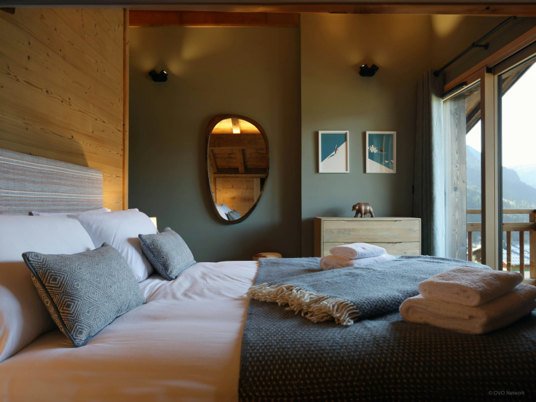 Trois des cinq chambres du chalet se trouvent au rez-de-jardin et peuvent être aménagées avec un lit double ou deux lits simples. Elles ouvrent toutes sur une terrasse ensoleillée équipée d’un jacuzzi. Les deux chambres supplémentaires, aménagées à l’étage supérieur, comptent chacune une salle de douche privative et un accès direct à un balcon.