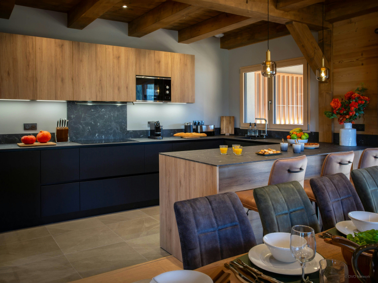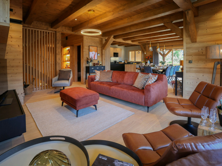 Le Chalet La Cachette est un logement moderne de trois étages pour 10 vacanciers, comptant cinq chambres et quatre salles de bains.