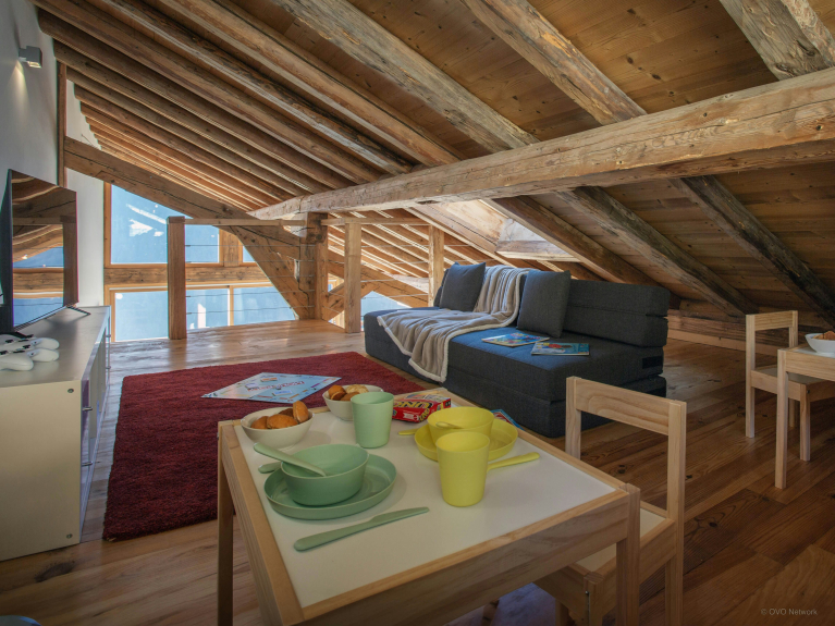 Une mezzanine surplombant le salon a été aménagée en salle de jeux et comprend une télévision, un canapé-lit, une console de jeux et des jeux de société. Cela deviendra vite l’endroit de prédilection des enfants et des adolescents !