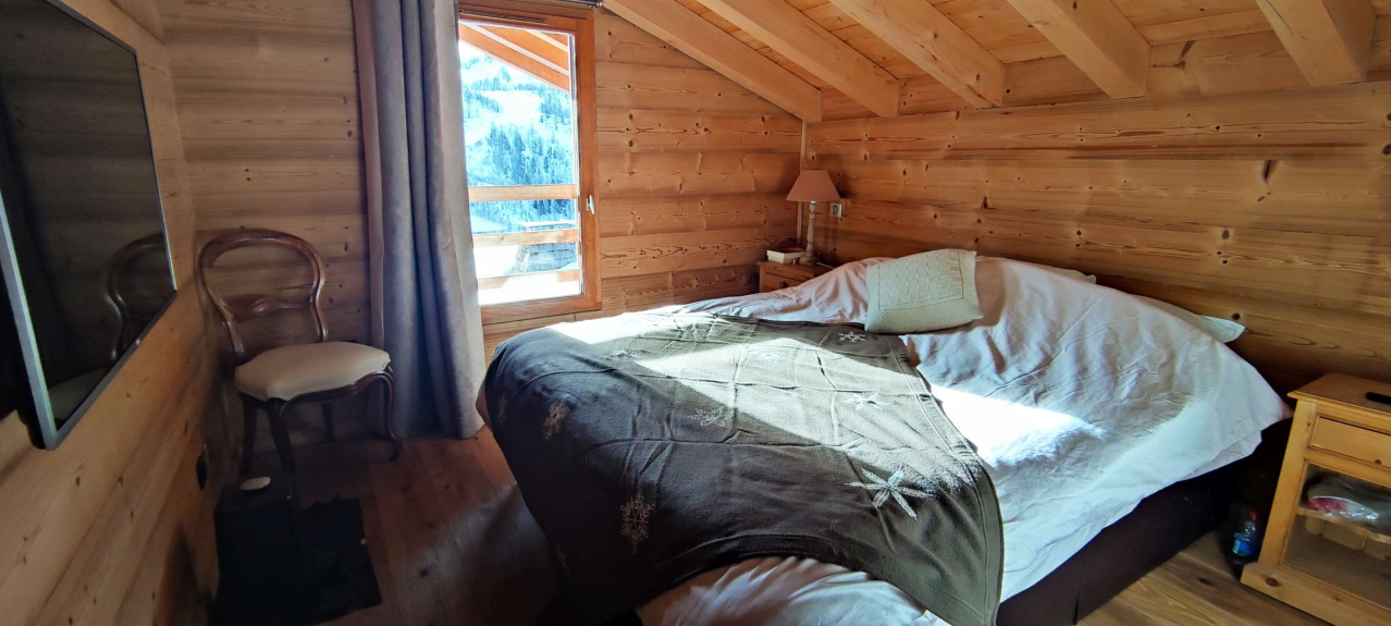 CM26 Magnifique chalet individuel de 150 m², entièrement rénové, de qualité haut de gamme, comprenant 5 chambres, 2 salles de bains, 2 salles d'eau, salon salle à manger avec cheminée et terrasse, cuisine américaine, situé sur les hauteurs de la station, avec vue panoramique sur les pistes et la montagne. Garage dans le chalet + 1 parking.