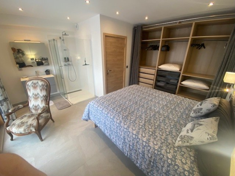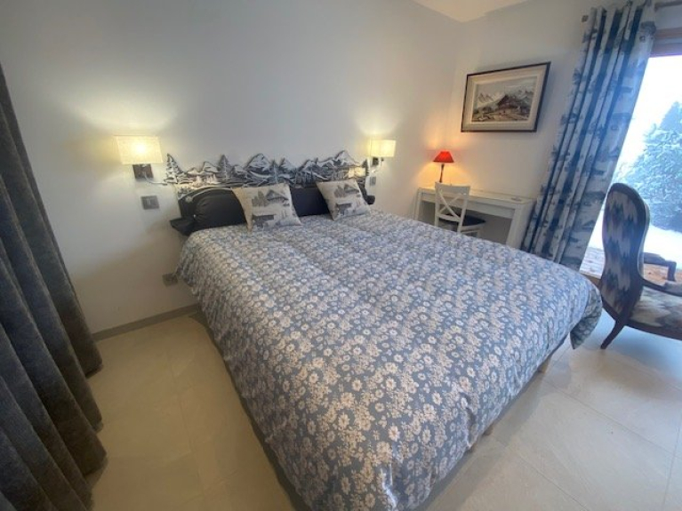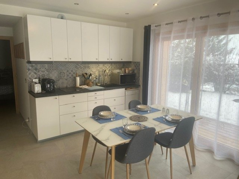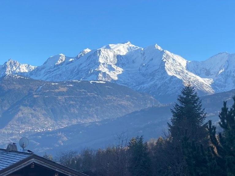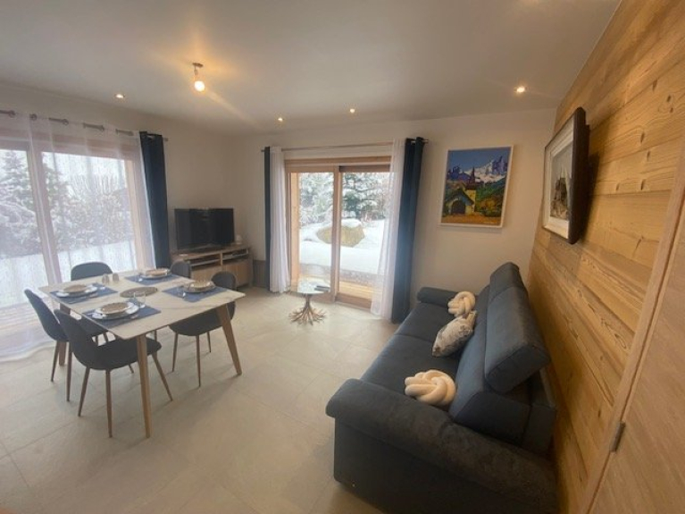 Dans chalet neuf, appartement de standing, très clair en rez de jardin, donnant sur une grande terrasse, avec vue exceptionnelle sur l'ensemble du massif du Mont Blanc et les Aiguilles de Warens, comprenant un séjour avec cuisine ouverte et canapé convertible 180, une chambre parentale avec lit de 160, grand dressing , douche et vasque,WC indépendant. Chauffage et production ECS pompe à chaleur, Place de stationnement en garage fermé. Centre village Combloux ou Cordon à 3kms, Pistes à 5kms.