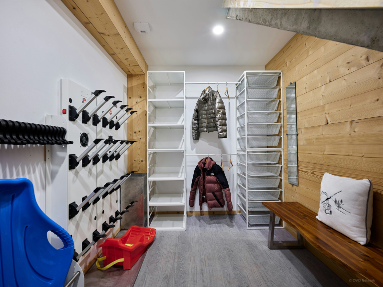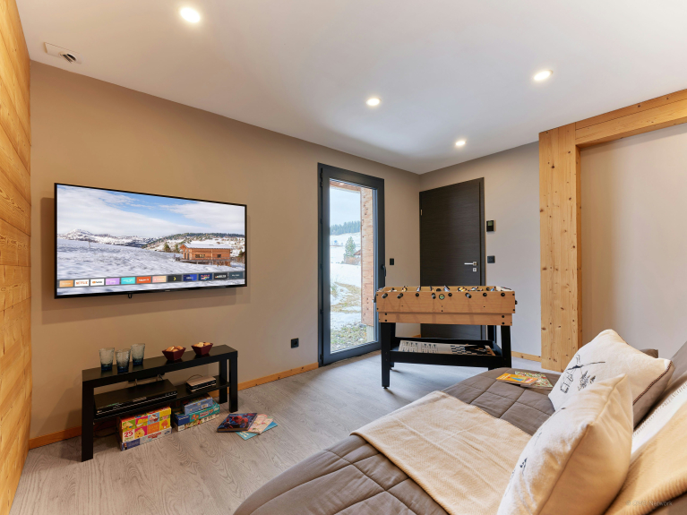 Le rez-de-jardin comprend un garage, un local à skis avec sèche-chaussures chauffant, et une salle de détente avec une télévision et un babyfoot. Six personnes peuvent prendre place dans un dortoir avec lits superposés, et bénéficier d’une salle de douche avec des toilettes séparées.