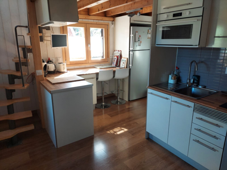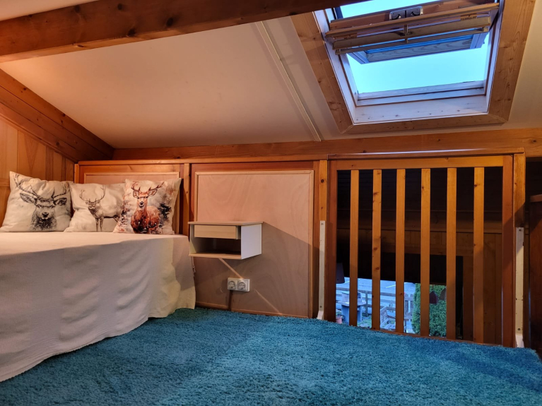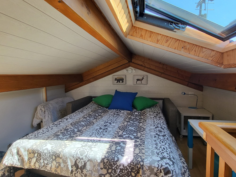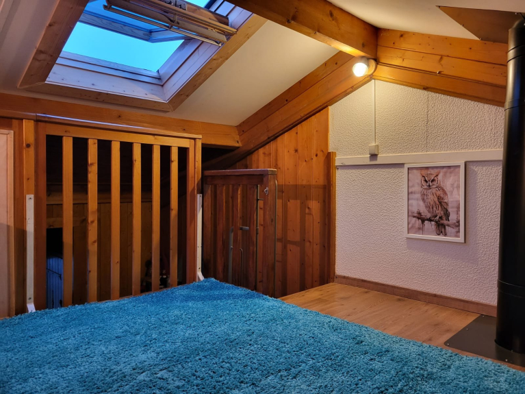A l'étage une chambre/ mezzanine mansardée (4) avec une grande velux. Canapé lit 140cm, coin TV.