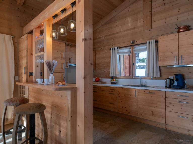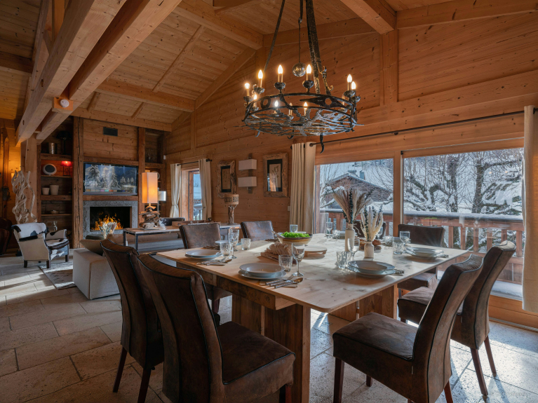 La cuisine ouverte et tout équipée est accompagnée d’une grande table à manger intérieure. Lors des journées ensoleillées, optez pour la terrasse orientée plein sud, où une seconde table vous permet de déjeuner face au jardin et aux sommets des Aravis.