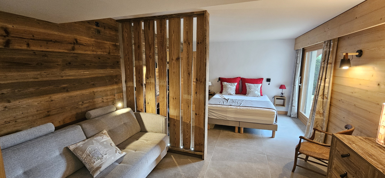 Au niveau inférieur : Une chambre en suite avec un lit double équipé d'un matelas neuf haut de gamme (160 x 200), son coin salon avec canapé lit (160) très confort, rangements, bureau avec écran plat, TV orange et les chaines Canal +, salle de douche / WC ainsi qu'un accès direct au jardin avec terrasse sur Mont Blanc.