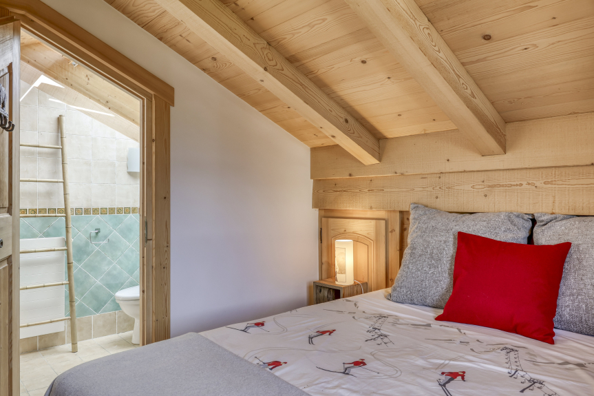 ° Une suite parentale avec lit, matelas neuf haut de gamme (160 x 200) - rangements - bureau & chaise - balcon avec vue panoramique sur le mont blanc, grande salle de bain avec baignoire, douche, rangement et WC.