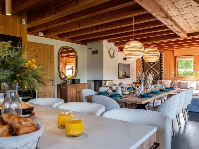 Jusqu’à 12 vacanciers (dont 10 adultes) peuvent séjourner au Chalet OCimes, qui compte cinq chambres et six salles de bains aménagées sur deux étages.