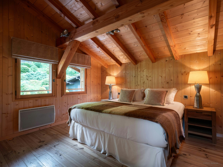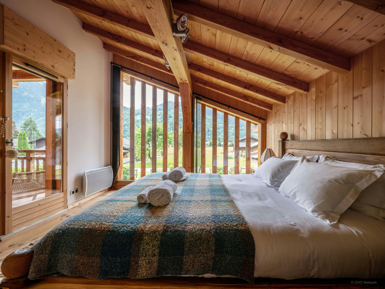 Jusqu’à 12 vacanciers (dont 10 adultes) peuvent séjourner au Chalet OCimes, qui compte cinq chambres et six salles de bains aménagées sur deux étages.