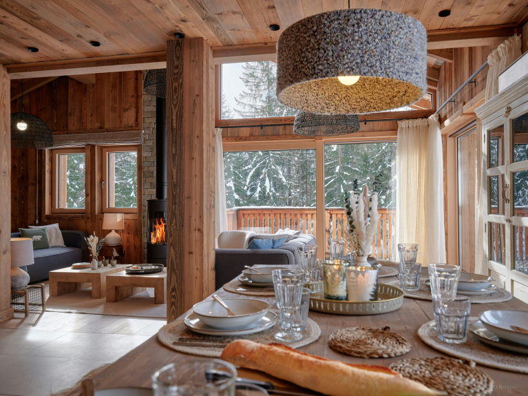 La pièce de vie aménagée au premier étage est baignée de lumière, grâce à de hautes baies vitrées et des portes-fenêtres donnant sur un ravissant balcon d’angle. De là, la vue sur le mont Charvin et les Aravis est absolument sensationnelle. Deux vastes canapés vous permettront de vous rassembler autour du poêle à bois pour vous raconter les aventures de la journée. Vous n’y trouverez pas de télévision, car le Chalet Marmot’Inn mise sur la convivialité.