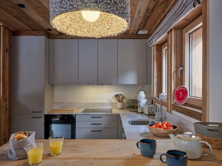La grande table à manger en bois massif permet de se réunir tous ensemble pour les repas, tandis que le comptoir qui sépare le salon de la cuisine est idéal pour le café du matin. Cette cuisine est équipée de tous les ustensiles nécessaires, qui sont de la plus haute qualité.