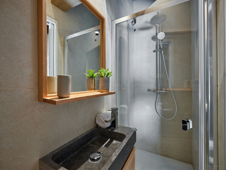 Dès l’entrée, le local à skis permet de se mettre à l’aise au retour des activités. Il est accompagné d’une buanderie très fonctionnelle, équipée d’un lave-linge et d’un sèche-linge.