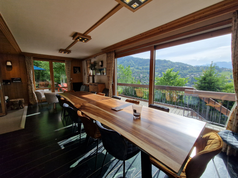 La situation du Chalet du Vernay dans une rue calme et résidentielle est idéalement orientée et permet de bénéficier d'un ensoleillement dès le midi jusqu'en soirée avec une vue exceptionnelle sur la chaîne des Aravis et des Fiz sur la terrasse, dans le jacuzzi et dans chaque pièce du Chalet.