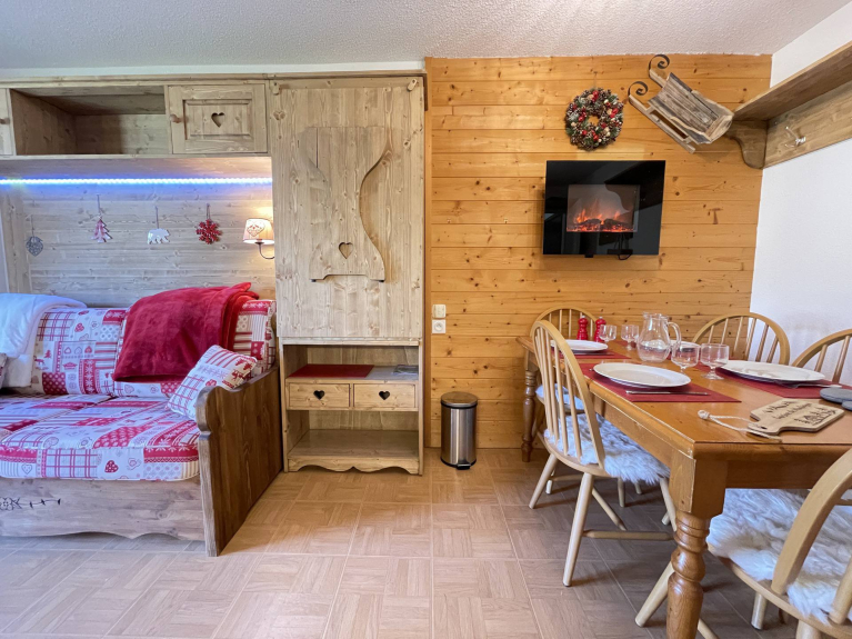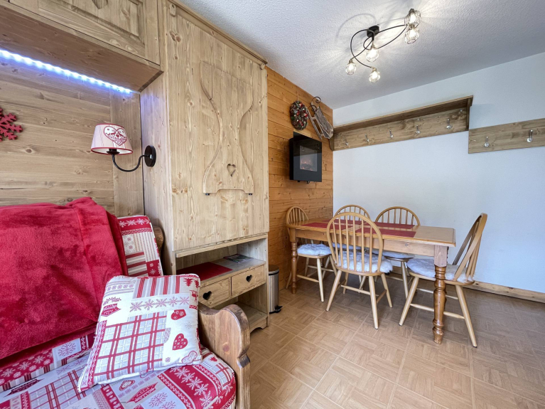 NOTRE AVIS : L'appartement bénéficie d'une décoration de style montagnard, tout confort. Vous profiterez d'un accès libre à la piscine intérieure, pour des moments de détente inoubliables. La résidence est classée 3 étoiles, garantissant un séjour de qualité.