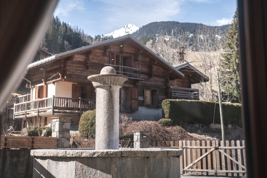 Un extérieur unique à Arêches : la terrasse de 110 m² avec sa fontaine en pierre (la fontaine n’est pas en eau).