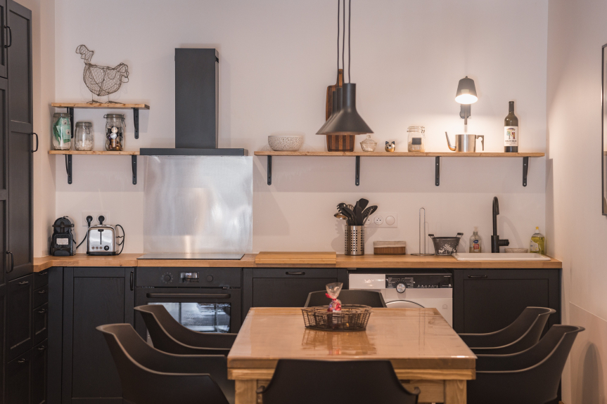 • Cuisine : plaque à induction, hotte, frigo-congélateur, four, micro-ondes, lave-vaisselle, lave-linge séchant, cafetières Nespresso et filtre, appareils à raclette et à fondue, et tout le nécessaire pour cuisiner