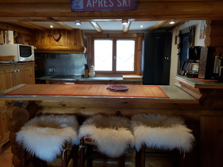 Entrée avec WC et lave-main. Séjour de 55m2 comportant 2 salons confortables avec coin feu, le tout ouvrant sur une terrasse de 25m2 avec vue sur le lac et les pistes. Cuisine américaine entièrement équipée, avec bar. Mezzanine avec coin télévision, jeux et lecture.