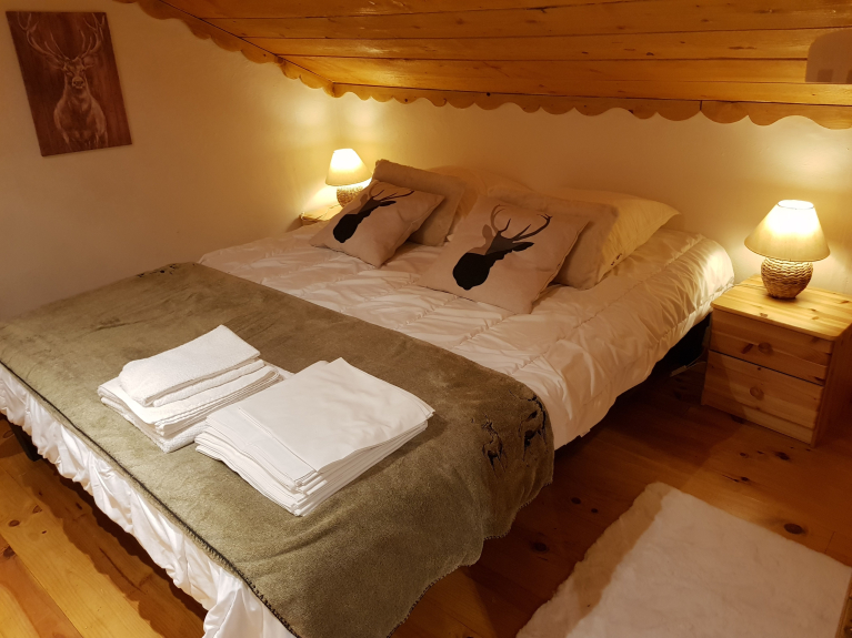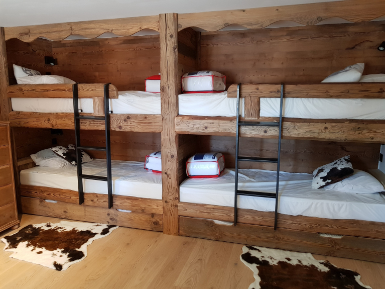 5 chambres doubles dont 3 suites parentales - 1 sous-pente (en enfilade) 2 lits simples - 1 dortoir 4 lits simples. Dortoir avec babyfoot et coin télé. Bain nordique extérieur. Sauna 6 places.
