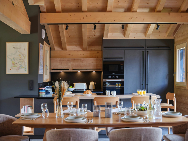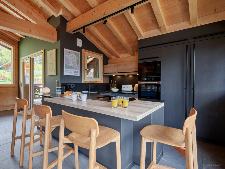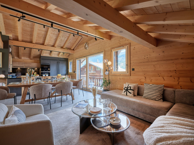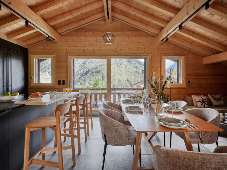 À l’étage supérieur, la pièce de vie à la belle charpente apparente profite pleinement de la lumière et d’une vue splendide sur les montagnes et la station d’Avoriaz. Le coin salon, avec canapé d’angle et télévision, est séparé de la cuisine tout équipée par une table à manger.
