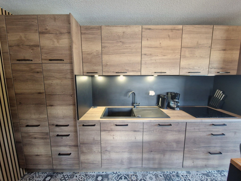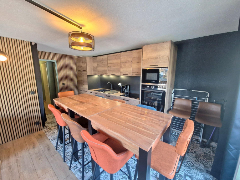 - Coin cuisine avec 4 plaques chauffantes, réfrigérateur, four, micro-ondes, lave-vaisselle et nombreux placards de rangement.