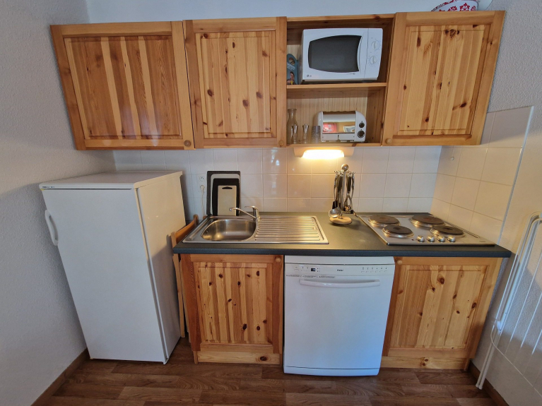 - Coin cuisine avec 4 plaques chauffantes, réfrigérateur, lave-vaisselle, micro-ondes.