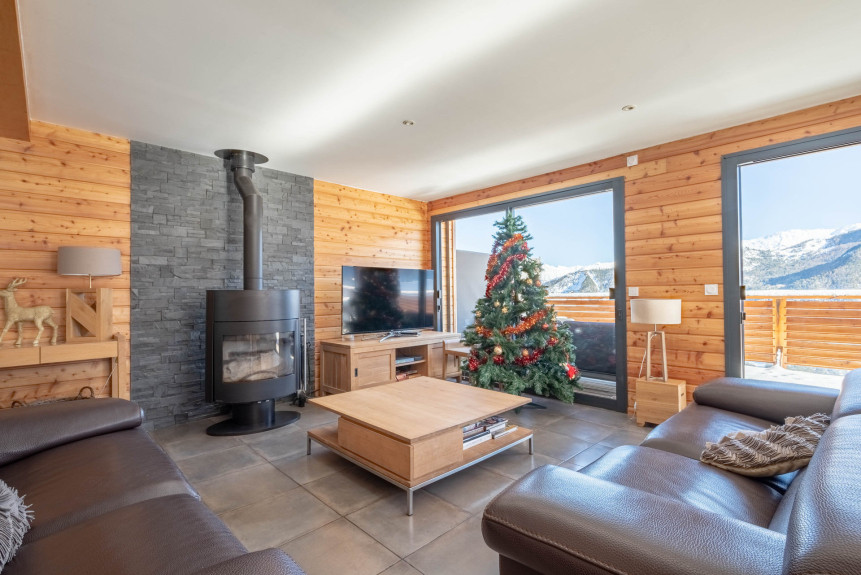 * Séjour / Salon spacieux : TV en HD, poêle à bois, canapés cuir, table basse, accès terrasse - solarium ;