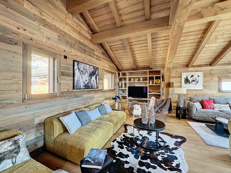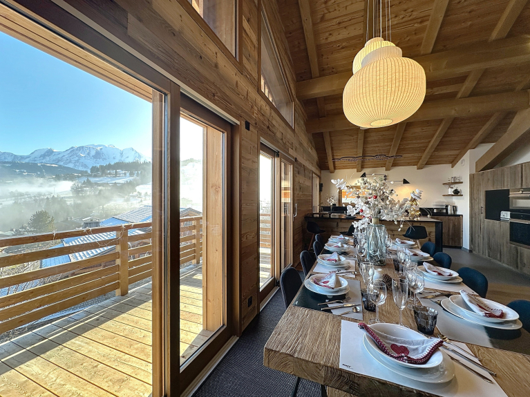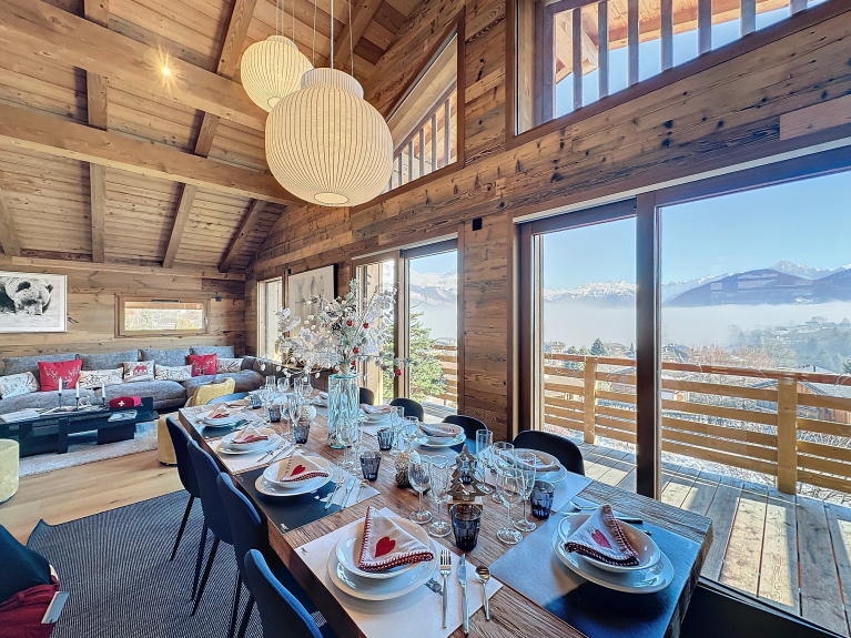 Ambiance chaleureuse et raffinée : profitez de vastes espaces de vie baignés de lumière. Installez-vous devant la cheminée et laissez-vous séduire par la beauté des Alpes.