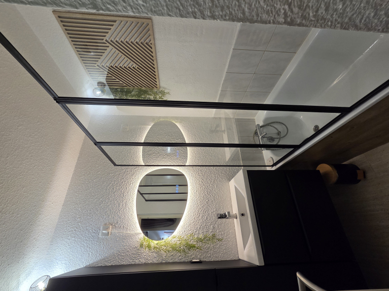 • 1 salle de bain avec baignoire, sèche-serviettes et rangements.