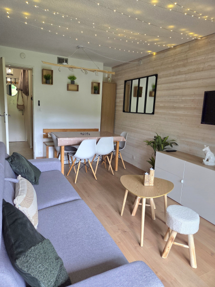 • 1 pièce de vie lumineuse avec canapé convertible (160*190 cm), TV, coin repas, rangements.