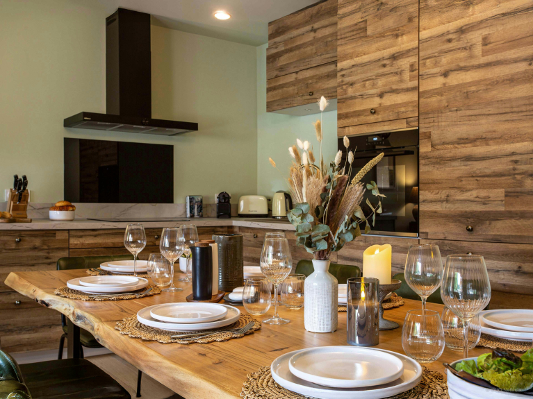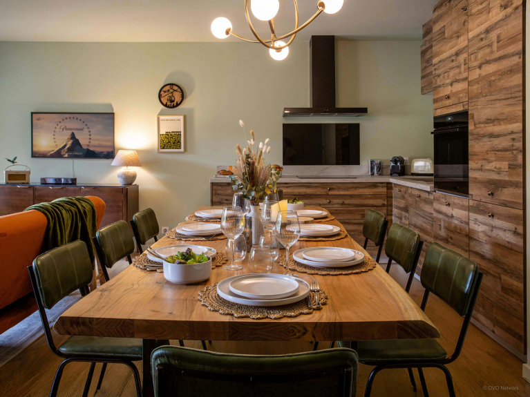 Dès l’entrée, vous découvrirez une élégante pièce de vie ouverte, à la fois chaleureuse et fonctionnelle, qui réunit un salon confortable, une grande table à manger, ainsi qu’une cuisine d’angle entièrement équipée.