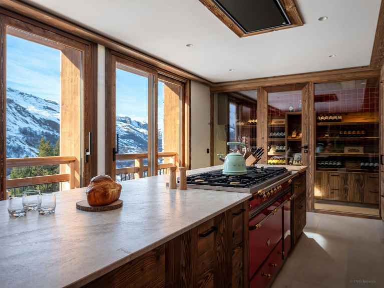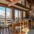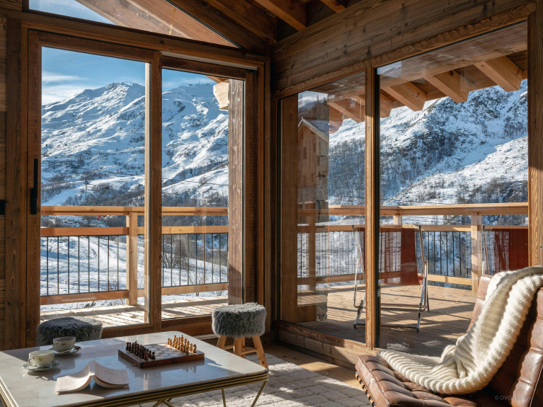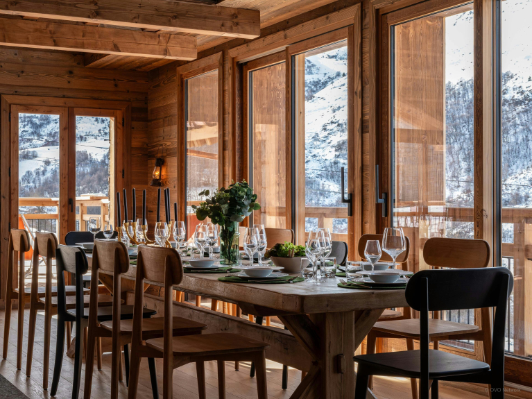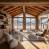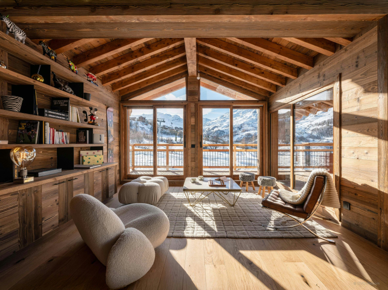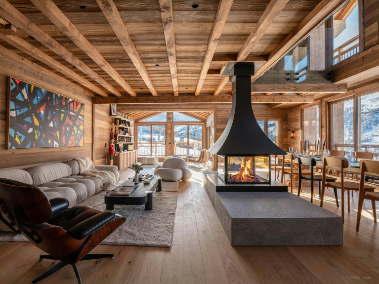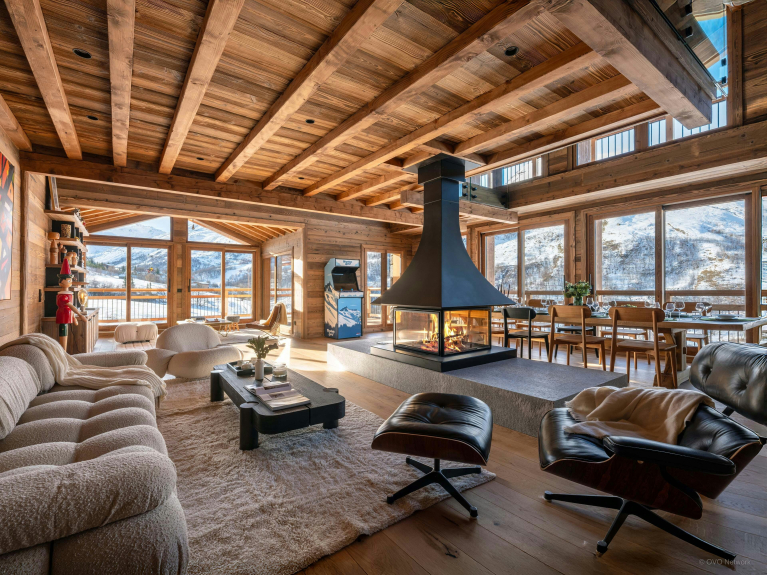 Au cœur du chalet, la grande pièce de vie impressionne par sa luminosité et sa décoration élégante. Ouverte sur l’extérieur par de vastes baies vitrées, elle s’articule autour d’une cheminée centrale à foyer ouvert, qui crée une séparation entre le salon et la salle à manger. Un coin lecture offre un espace plus paisible, tandis qu’une mezzanine propose un salon télévision avec des jeux de société, parfait pour prolonger les soirées.