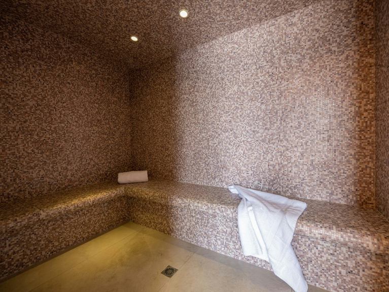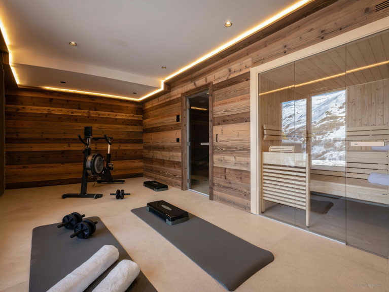 À l’étage inférieur, vous trouverez cinq chambres doubles et un dortoir pour quatre, parfait pour des enfants. C’est à ce niveau également que se trouve l’espace bien-être du chalet : sauna, hammam, ainsi qu’une salle de sport qui ouvre sur une terrasse extérieure comprenant le jacuzzi.