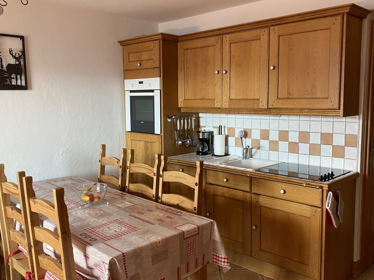 - Coin cuisine tout équipé : lave vaisselle, cafetière électrique, bouilloire électrique, micro-ondes, 4 plaques vitrocéramique, four, grille-pain,