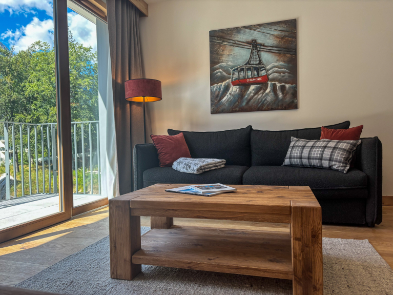 - Un balcon-terrasse de 5,2 m² exposé ouest, vue sur le Brévent et soleil l’après-midi