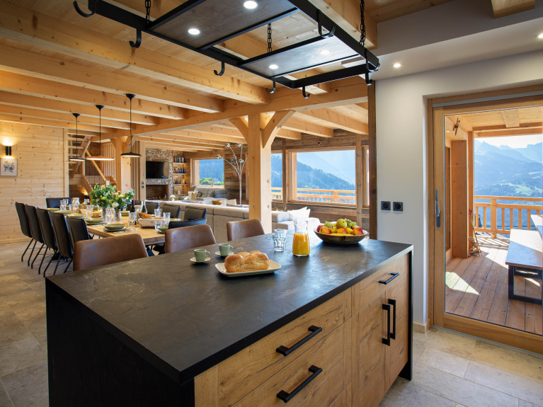 Vaste pièce de vie lumineuse avec vue panoramique sur les montagnes, salon TV séparé, salle à manger pour 14 convives et cuisine entièrement équipée (2 réfrigérateurs, 2 fours, congélateur, lave-vaisselle, lave-linge et sèche-linge).