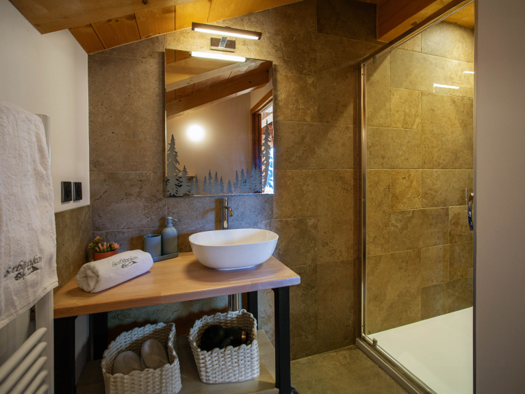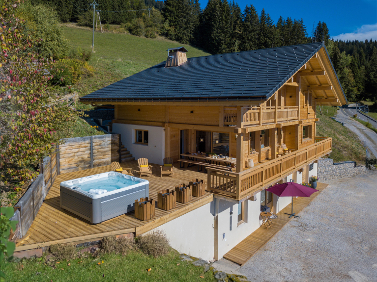 Le chalet bénéficie de son propre espace bien-être privatif comprenant jacuzzi, hammam et sauna.