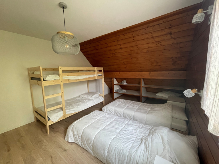 - un premier étage avec 3 chambres : deux chambres spacieuses dont une avec un lit double et l'autre avec 2 lits simples jumelables, une chambre spacieuse avec 2 lits simples jumelable et un lit superposé. Toilette séparée. Salle de bains avec une douche et une baignoire.