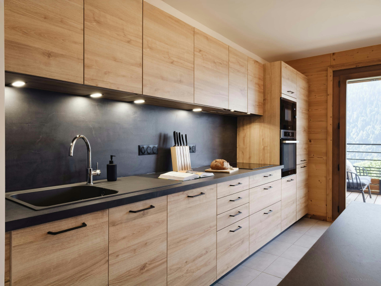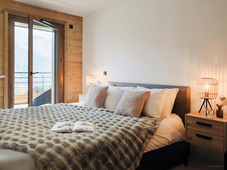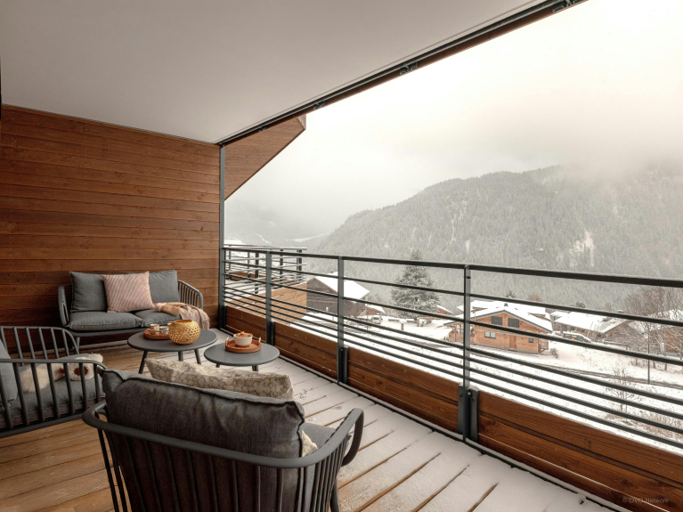 La lumière naturelle inonde la pièce de vie grâce à de grandes baies vitrées. Le salon avec canapé et télévision invite à la détente, tandis que la cuisine équipée et son comptoir se prêtent aux instants gourmands. La table à manger profite d’un panorama fabuleux, transformant chaque repas en spectacle. À l’extérieur, deux balcons plein sud, aménagés de fauteuils, offrent une vue imprenable sur le village et les sommets des Portes du Soleil.