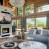 La pièce de vie est baignée de lumière grâce à de nombreuses fenêtres et baies vitrées. Le coin salon est généreux et confortable, avec deux vastes canapés faisant face à une cheminée et à une télévision grand écran. Une cuisine moderne tout équipée avec un comptoir s’ouvre naturellement sur le reste de la pièce.