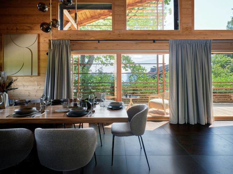 En fonction de la météo, vous pourrez choisir entre deux tables à manger : une à l’intérieur et une seconde sur une terrasse. Celle-ci possède également un coin salon, pour profiter de l’écrin de verdure et de la vue sur les montagnes.