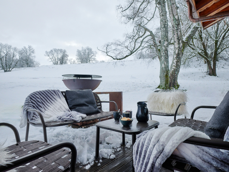 En fonction de la météo, vous pourrez choisir entre deux tables à manger : une à l’intérieur et une seconde sur une terrasse. Celle-ci possède également un coin salon, pour profiter de l’écrin de verdure et de la vue sur les montagnes.