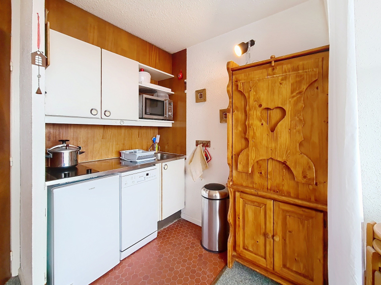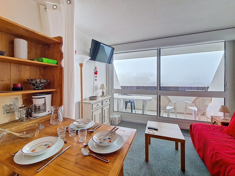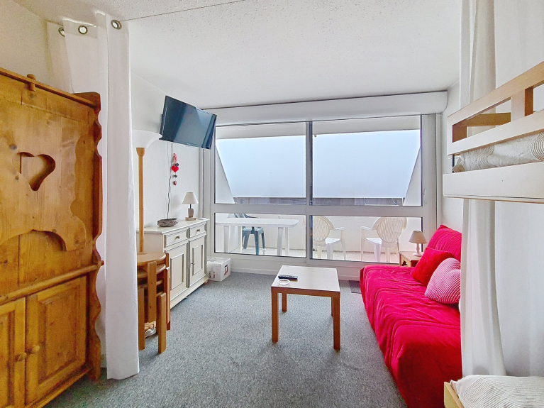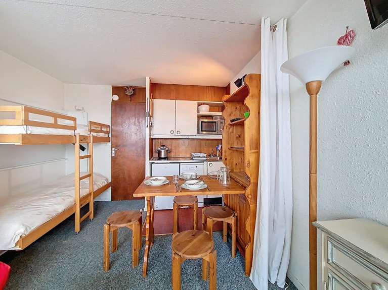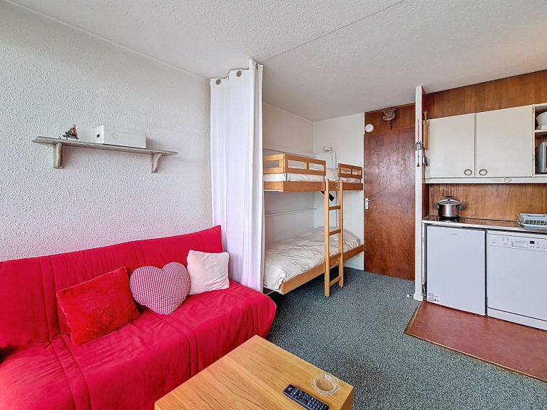 Studio de 19m² lumineux, magnifique vue sur la chaine de montagnes pour trois personnes. Il est situé au 13ème étage avec ascenseur. Casier skis privatif.