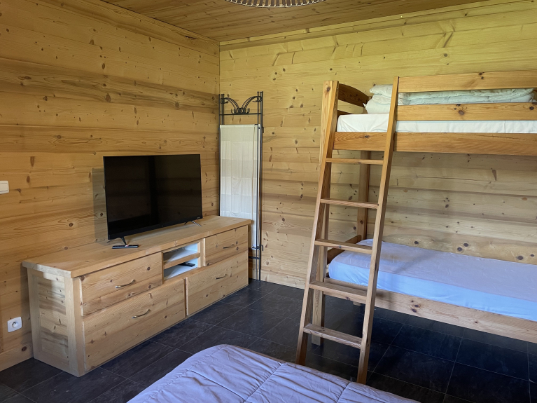 La chambre est équipée d'un lit 140x190, et de lits superposés 90x190. (attention, le lit supérieur d'un lit superposé est interdit aux - de 6 ans) il y a une télévision et de nombreux rangements.